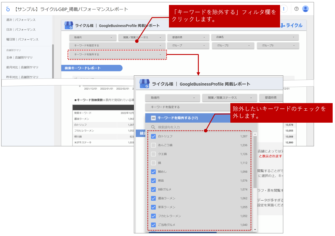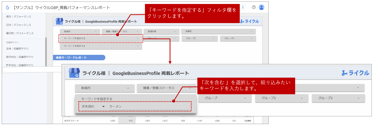 ご契約ビジネスグループで管理されている開業中店舗すべての Google ビジネスプロフィールの検索キーワードデータ を参照します。