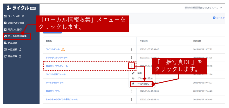 2 ローカル情報収集募集一覧画面に進み、写真を一括ダウンロードを開始します。