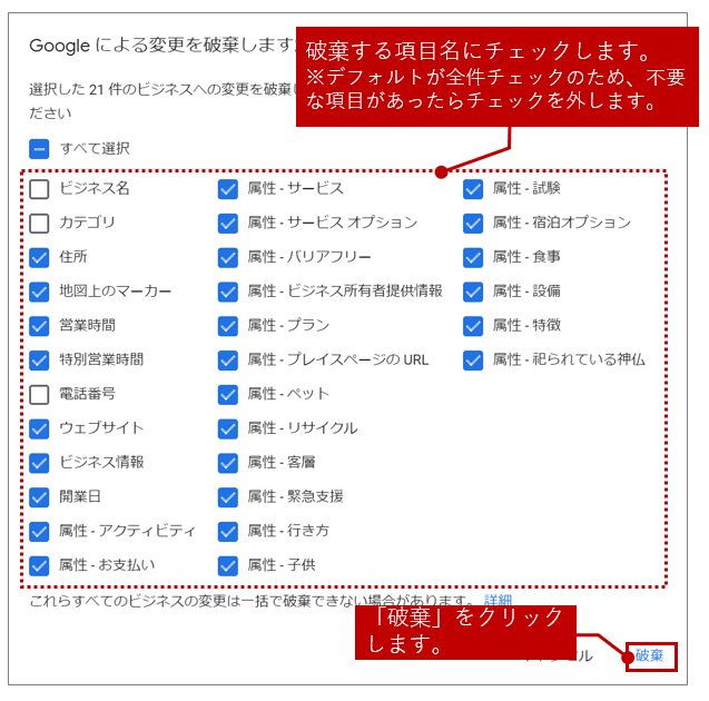保守対象外のシートで Google による変更は、Google ビジネスプロフィールの管理画面open_in_new から変更を破棄することができます。