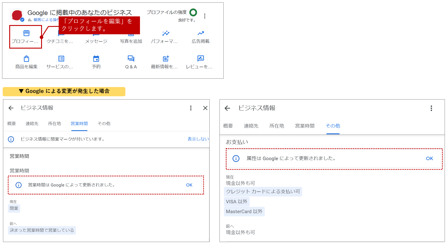 Google による変更内容は、Google ビジネスプロフィールのプロフィール編集画面から確認できます。