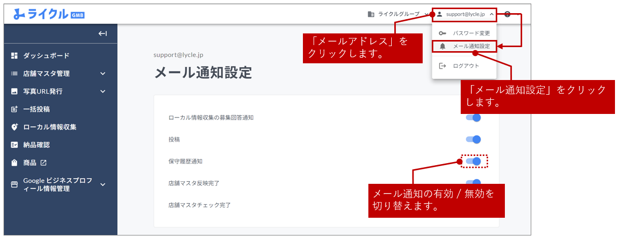 ライクル管理画面右上の「メールアドレス」>「メール通知設定」から、メール通知の有効または無効の切り替えが可能です。
