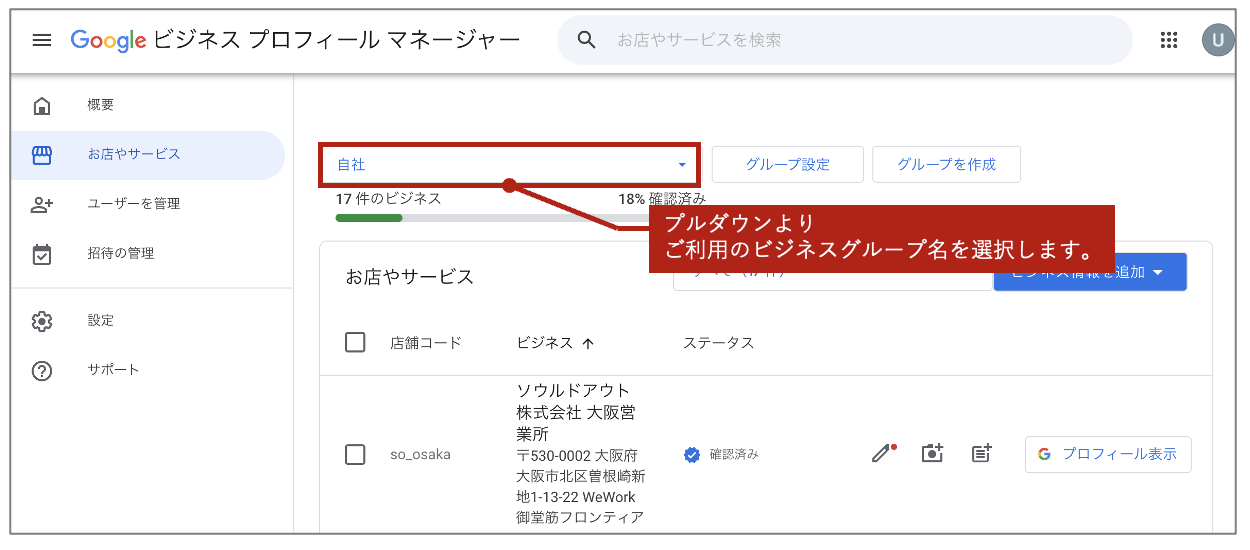 1 Google ビジネスプロフィール マネージャ(Google ビジネスプロフィール管理画面)open_in_new から、ご利用のビジネスグループ一覧を表示します。