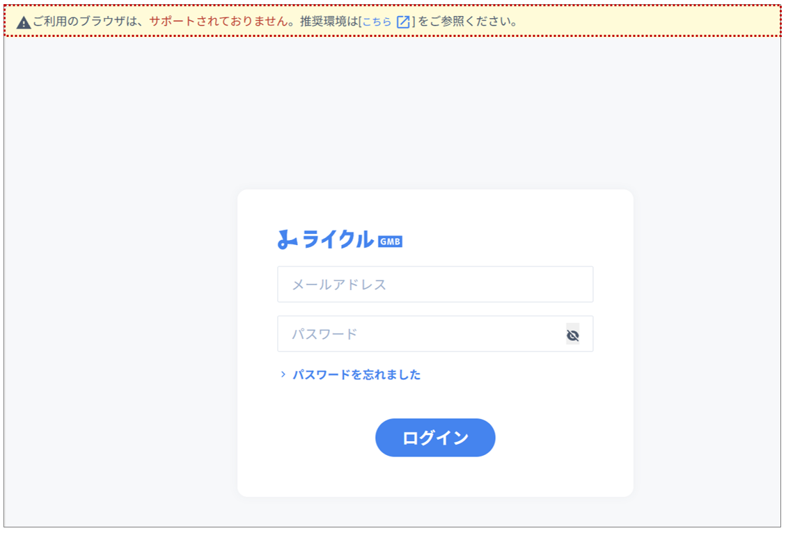 ライクル管理画面の推奨環境 2024年01月17日 13:02 更新 推奨環境 ライクル管理画面を推奨環境外のデバイスやブラウザで表示した場合、画面上部に「サポートされていない」という旨の表示がされます。 ライクル推奨環境open_in_new に記載されているデバイスやブラウザをご利用ください。 関連記事 「店舗マスタダウンロード機能リニューアル」のお知らせ