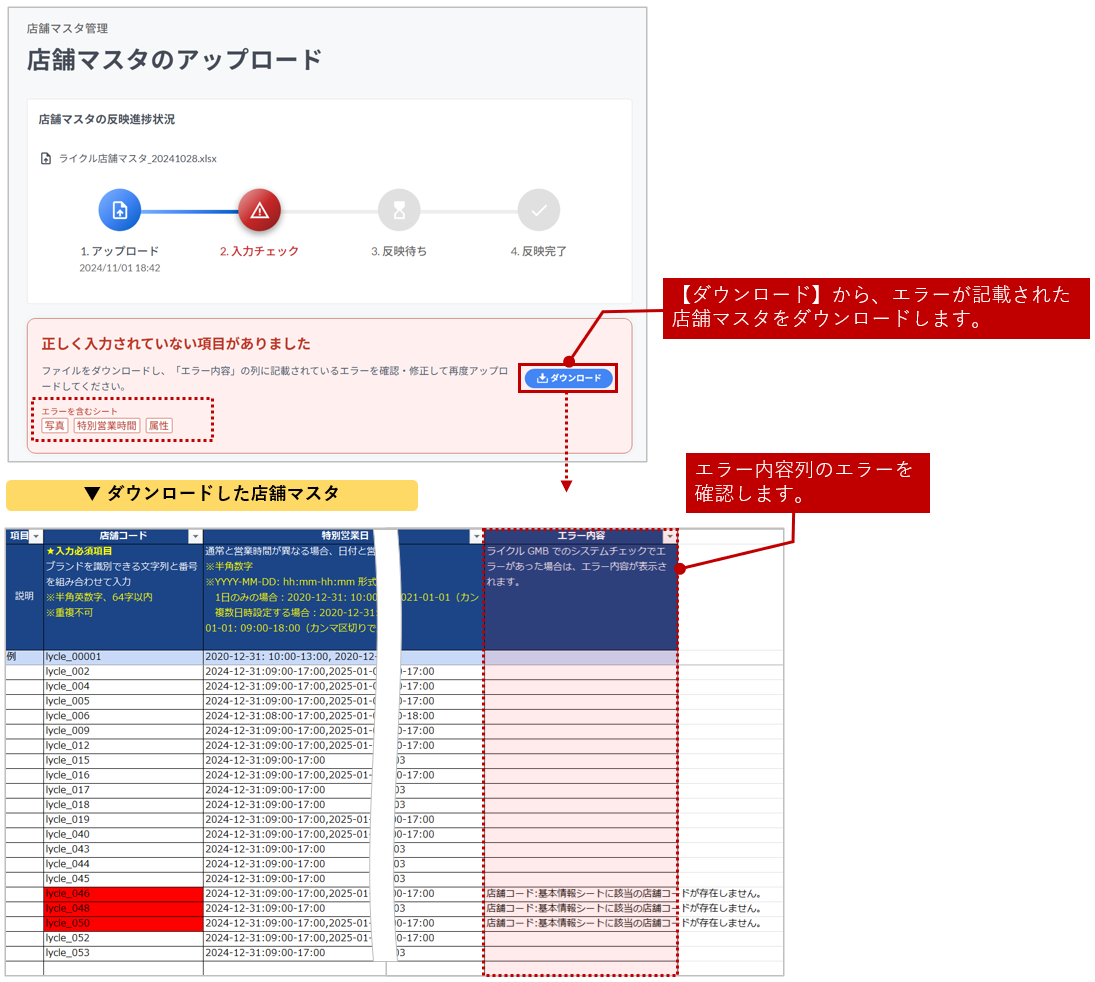 エラー内容が記載された店舗マスタファイルをダウンロードし、「エラー内容」の列に記載されているエラーを確認してください。